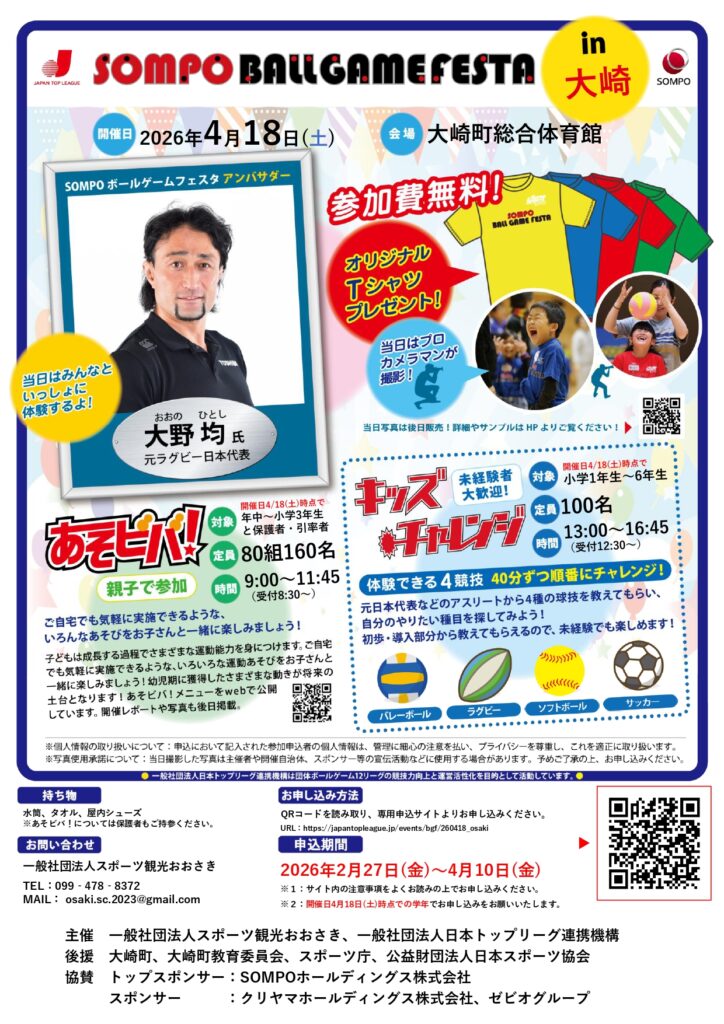 日本トップリーグ連携機構とスポーツ観光おおさきが主催する地域密着型のスポーツイベントで、主に小学生を対象に、さまざまな団体ボール競技を体験するプログラムです。