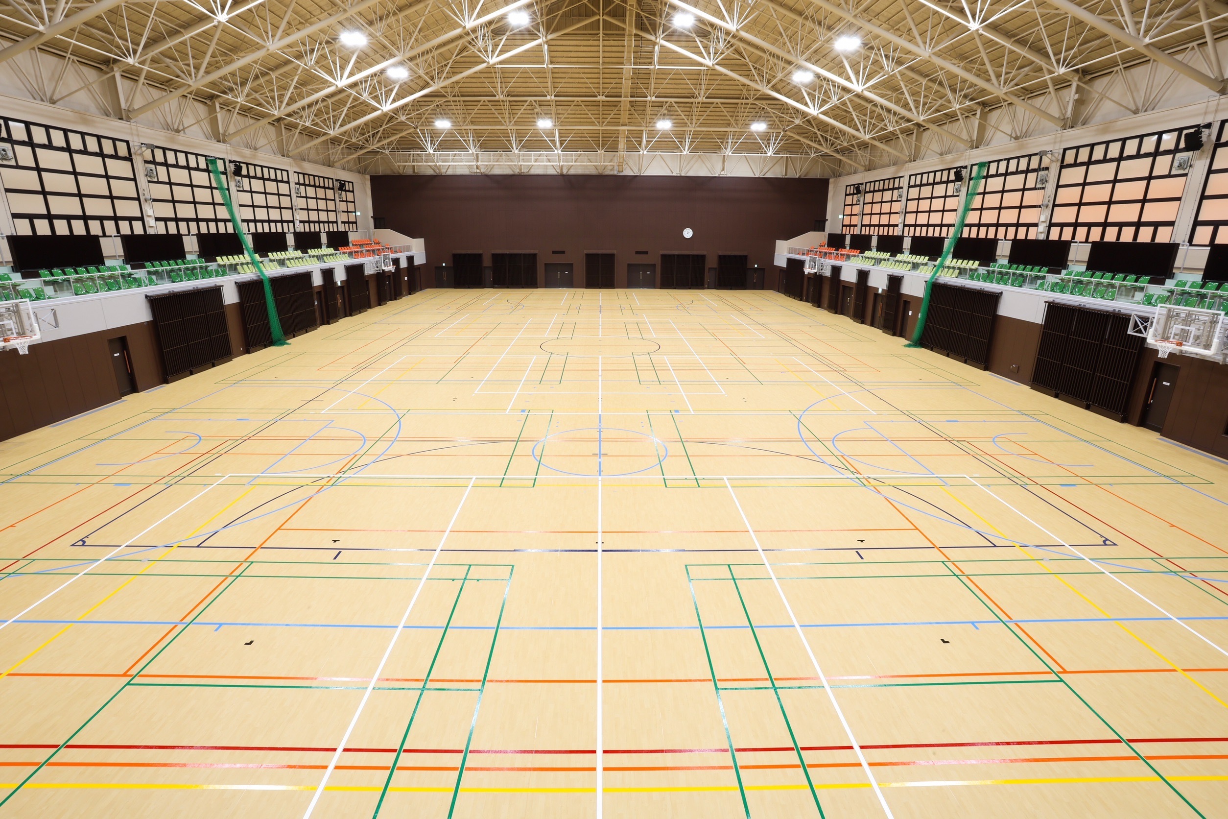 今回の大規模改修は、屋根の改修工事、アリーナ床の張替え、照明のLED化、空調設備の新設等を行いました。また、これまでの総合体育館の使用料及び照明料を見直し、新たに冷暖房料を新設いたしました。