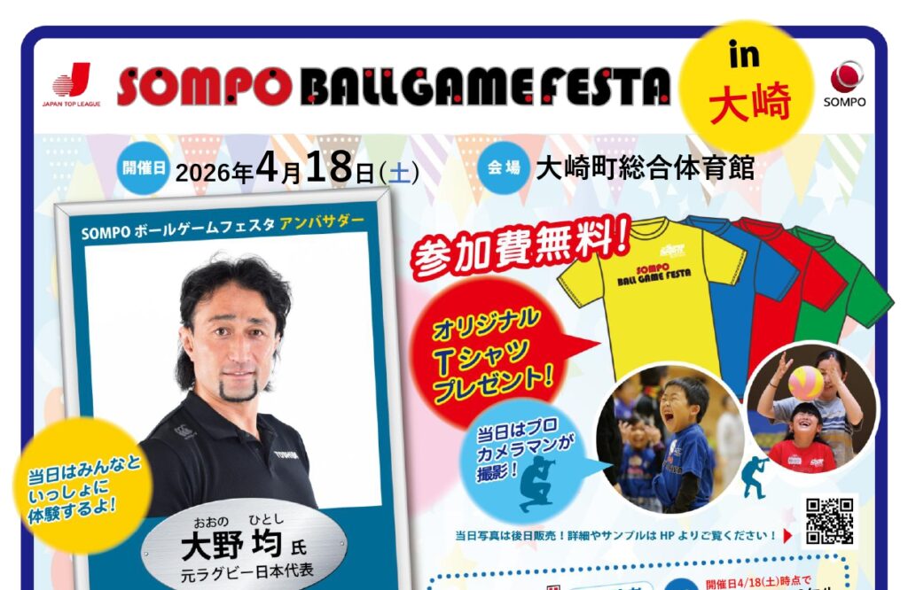 日本トップリーグ連携機構とスポーツ観光おおさきが主催する地域密着型のスポーツイベントで、主に小学生を対象に、さまざまな団体ボール競技を体験するプログラムです。同機構に加盟するリーグに所属、又所属していたトップアスリートが、運動の楽しさや... -